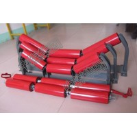 三聯(lián)托輥位于膠帶跑偏一方的倒托輥傾角大于另一方側(cè)托輥的傾角.這便導(dǎo)致中間托輥發(fā)生偏轉(zhuǎn)產(chǎn)生調(diào)心力。這個(gè)調(diào)心力將對膠帶產(chǎn)生與跑偏方向相反的推力,使膠帶糾偏懸掛式槽型托輥的這種特性保證了膠帶輸送機(jī)在上料誤差,氣溫、風(fēng)向變化等多種條件下,總能正常運(yùn)行。